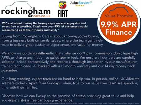 Cash Price: £11,990 | Deposit: £1,200 | 48 Month Term | First Payment: £187.82 | 46 Monthly Payments of £187.82 | Amount of Credit: £10,790 | Total Charge for Credit: £3,055.04 | Total Amount Payable £15,045.04 | 9.9% APR Representative | 7.14% Rate of Fixed Interest | Admin Fee: £10 | Final Payment: £5,017.50 | Annual Mileage: 40,000 | Excess Mileage Charge: 10p per mile
